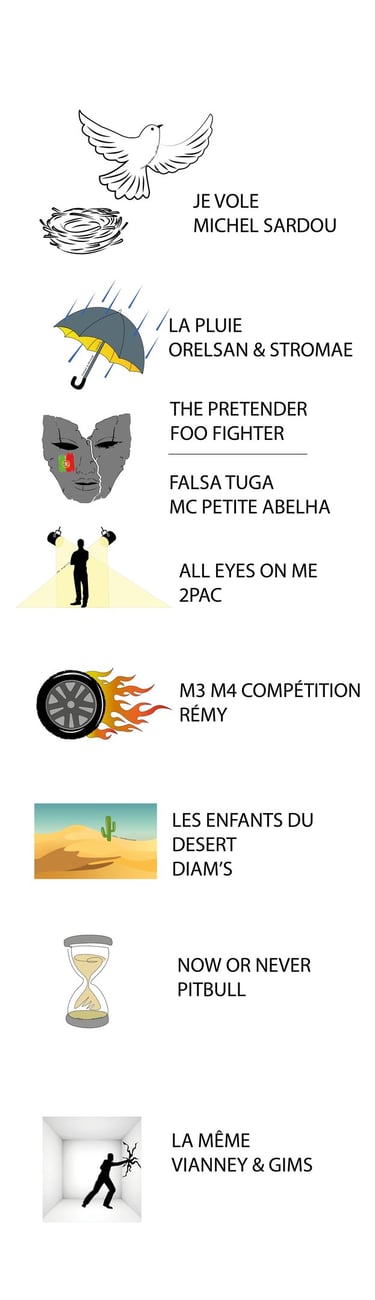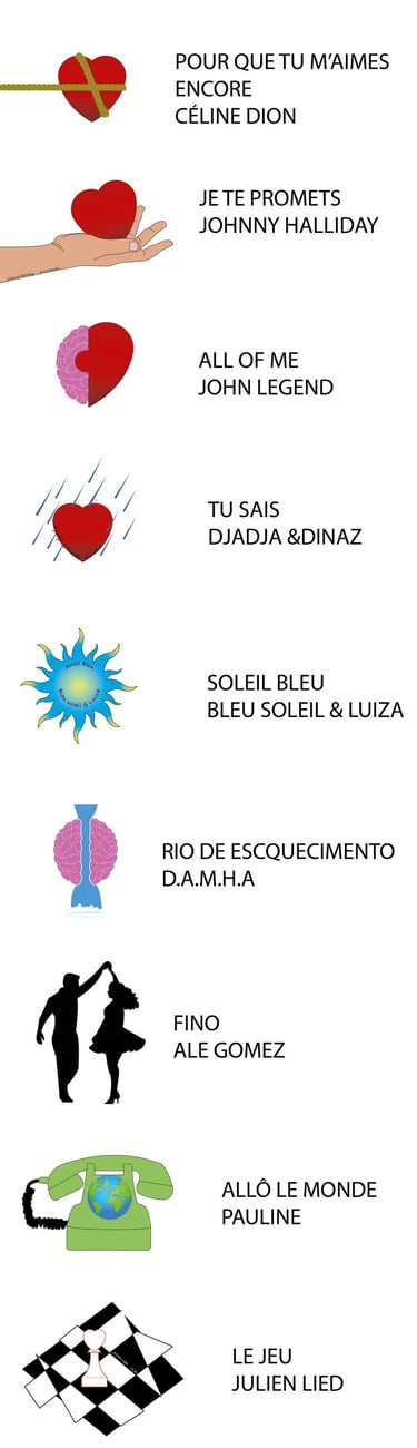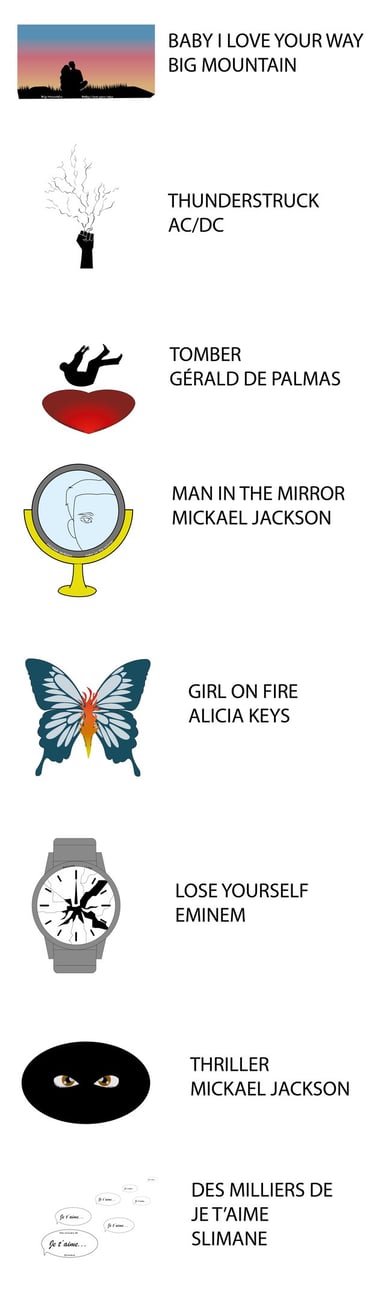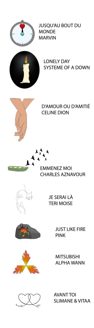 Créer une petite illustration représentant chaque chanson, dans un univers simple, légèrement enfantin, mais tout de même travaillé.